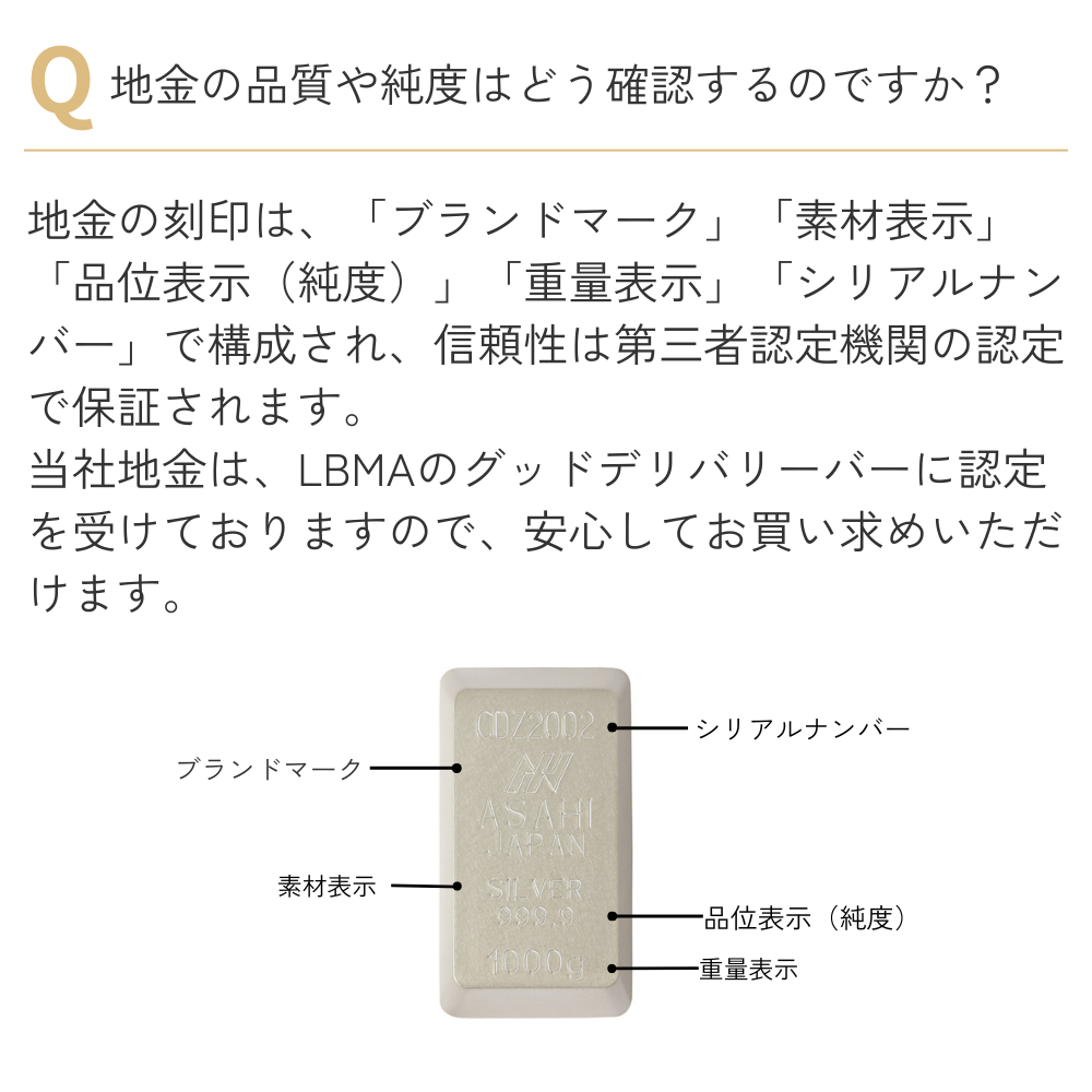 ・銀インゴット製品はその商品特性上、硫化による変色、裏面に凹みが発生することがありますが、重量・純度には影響ありません。